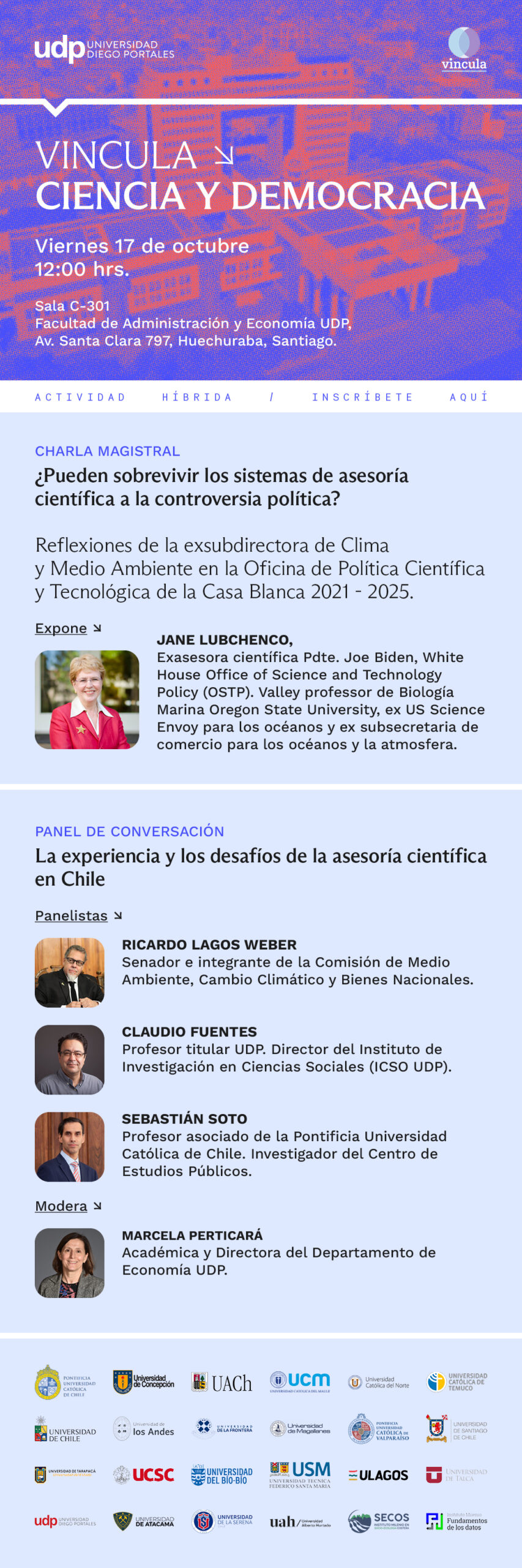 El ciclo de Charlas Magistrales «ciencia y democracia» son un espacio de encuentro y reflexión sobre los desafíos y oportunidades que el encuentro entre la ciencia y la política genera. Sus objetivos son: